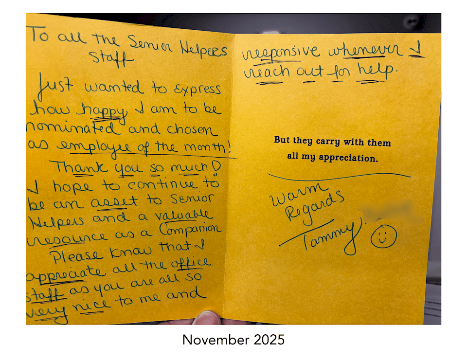 When you accept a job as a caregiver with Senior Helpers, you aren't just joining any company, you are joining a rapidly growing family who truly care about you and your professional development. Your experience has meaning here, and every day presents a new opportunity for learning, growth, and the creation of fun, meaningful relationships with our greatest generation.