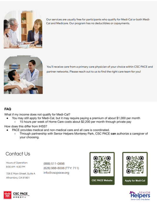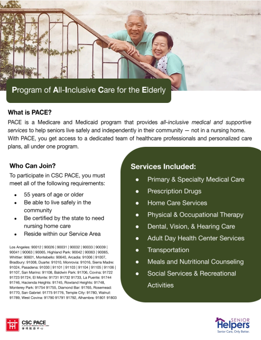 PACE is a Medicare and Medi-Cal program that provides coordinated, wraparound services to help seniors with chronic care needs continue living in their homes and communities, rather than moving to long-term care facilities. CSC PACE participants receive a full spectrum of care including primary medical services, therapy, social activities, and now, trusted in-home care through Senior Helpers.