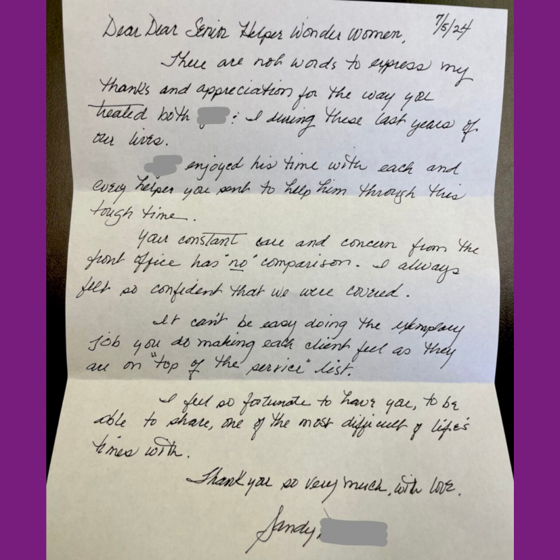 Our team has grown to include over 60 caregivers and staff. We have been honored to serve hundreds of seniors in our community over the years, and we are committed to continuing to provide uncompromising levels of care to all our families.
