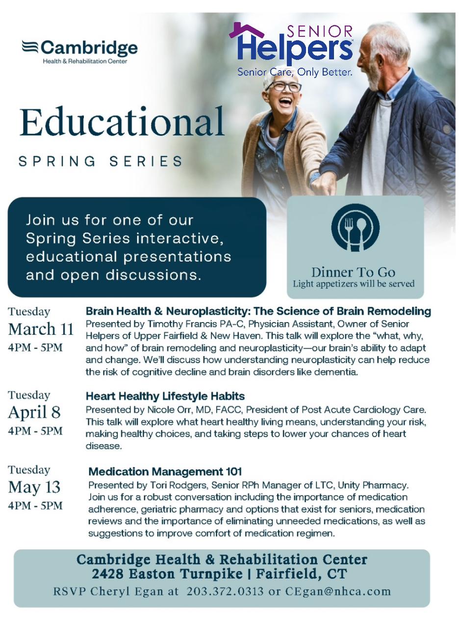 Timothy Francis, PA-C, Owner of Senior Helpers Home Care, in partnership with Cambridge Health & Rehabilitation Center is excited to participate as the first presenter in CHRC's Educational Spring Series!