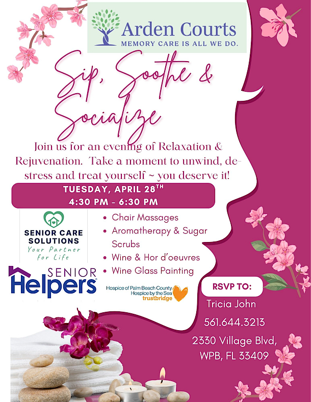 Take a well-deserved break and join Senior Helpers of West Palm Beach for a special evening dedicated to relaxation, rejuvenation, and meaningful connection. Sip, Soothe & Socialize is designed to help you unwind, de-stress, and enjoy a little self-care—you deserve it!