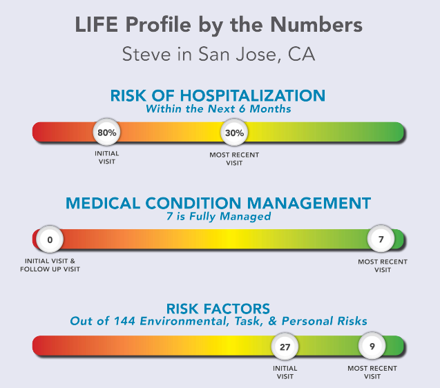 Senior Helpers' involvement began with a comprehensive LIFE Profile assessment for Steve. This proprietary assessment tool takes a deep dive into a senior’s ability to age in place successfully. For Steve, the assessment identified over 25 potential environmental safety risks and highlighted gaps in managing his medical conditions, predicting a high risk of hospitalization within six months.