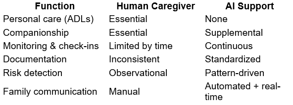 There is a tendency to frame AI as a replacement for caregivers—devices in the home, robots, and automation stepping in for people. That framing is not just simplistic—it’s wrong. The more likely, and more effective, path forward is a blended model, where technology supports care rather than substitutes for it.