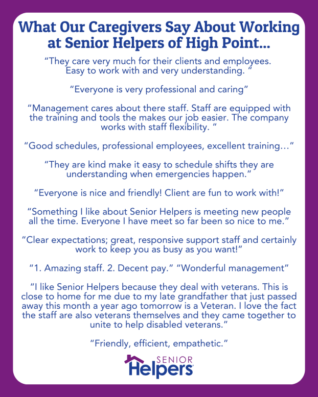 Senior Helpers caregivers in High Point, North Carolina provide one-on-one care to help our clients remain safe and independent in their home. We fit your area of expertise to the seniors you’ll care for.