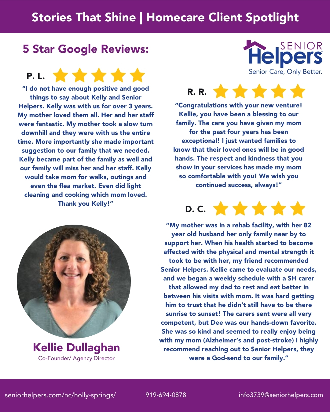 We are proud to have had the opportunity to care for and support seniors and families in the Holly Springs community and the surrounding areas. Hear what they have to say about the services that we have provided: