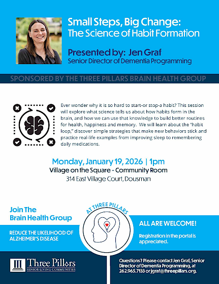 Reignite focus, confidence, and mental energy. Back by popular demand, this January session helps you jump-start your brain health for the year ahead. Led live online by Dr. Michelle Braun, national brain health expert, neuropsychologist, and author of High-Octane Brain: 5 Science-Based Steps to Sharpen Your Memory and Reduce Your Risk of Alzheimer’s, with onsite Three Pillars facilitation. This engaging session will highlight how you can meet your brain health goals with EXCELS, a five-step, science-based model shown to support memory, joy, and independence while reducing Alzheimer’s risk. You will engage in socially based cognitive exercises — guided group activities that strengthen thinking skills and address common “brain blips,” such as forgetting why you walked into a room or struggling to find the right word. The session includes live Q&A, a seasonal brain-healthy recipe, and proven results — 100 percent of past participants reported improved memory!