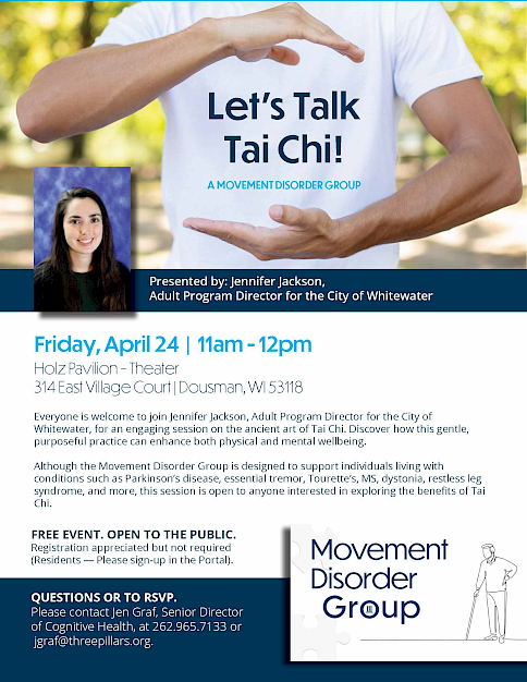 Everyone is welcome to join Jennifer Jackson, Adult Program Director for the City of Whitewater, for an engaging session on the ancient art of Tai Chi. Discover how this gentle, purposeful practice can enhance both physical and mental wellbeing. Although the Movement Disorder Group is designed to support individuals living with conditions such as Parkinson’s disease, essential tremor, Tourette’s, MS, dystonia, restless leg syndrome, and more, this session is open to anyone interested in exploring the benefits of Tai Chi.